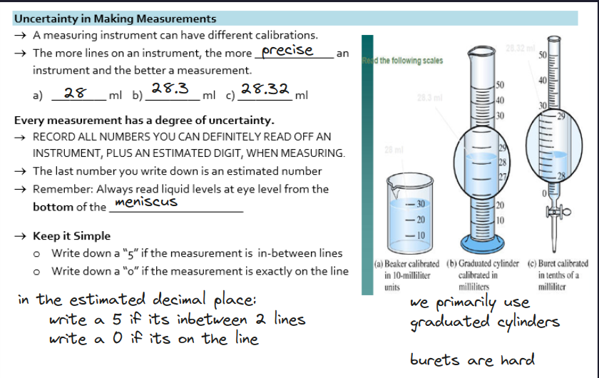 Common Measurements made in class: mass: gram(g) volume : liter (L) → mililiters (mL) temperature celcsius ( C )