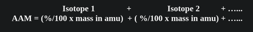 Calculate the average atomic mass of bromine. One isotope of bromine has an atomic mass of 78.92amu & a relative abundance of 50.69%. The other major isotope of bromine has an atomic mass of 80.92amu & a relative abundance of 49.31%.
