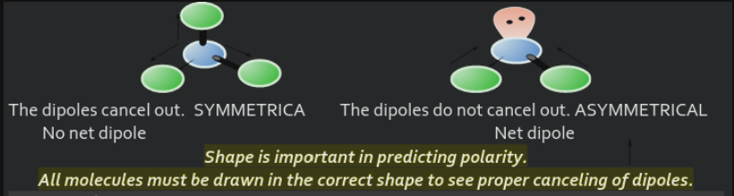 dipoles must move in equal but opposite directions in order for the forces to cancel and the molecule to be nonpolar.