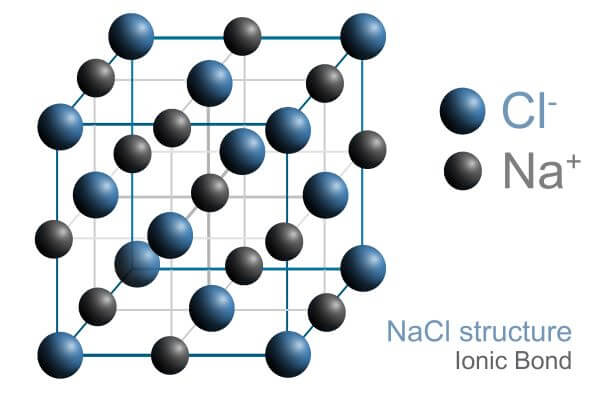 ionic compounds form a lattice framework, alternating positive and negative ions closely packed together.
