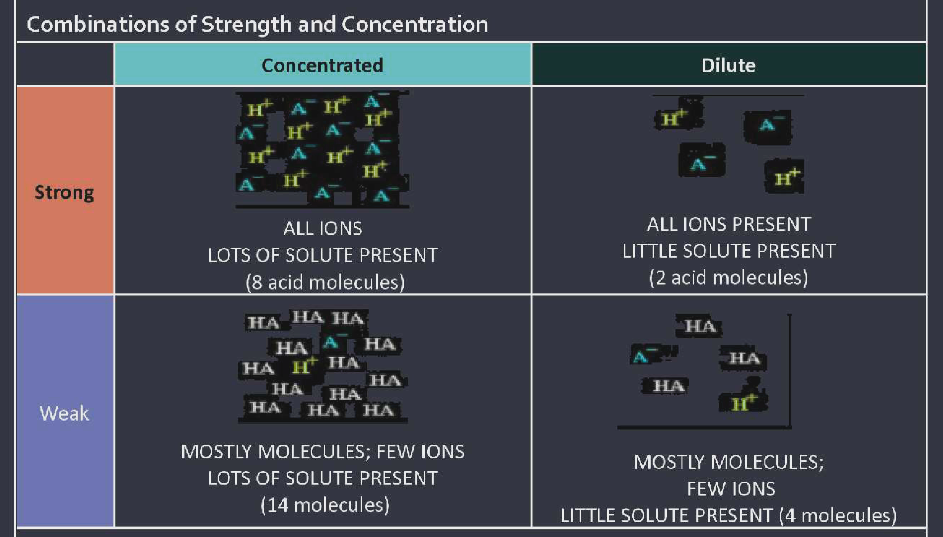 Concentrated acid: Lots of acid ( solute ) is dissolved into water ( solvent ) Dilute acid: A little amount of acid ( solute ) is dissolved into water ( solvent )