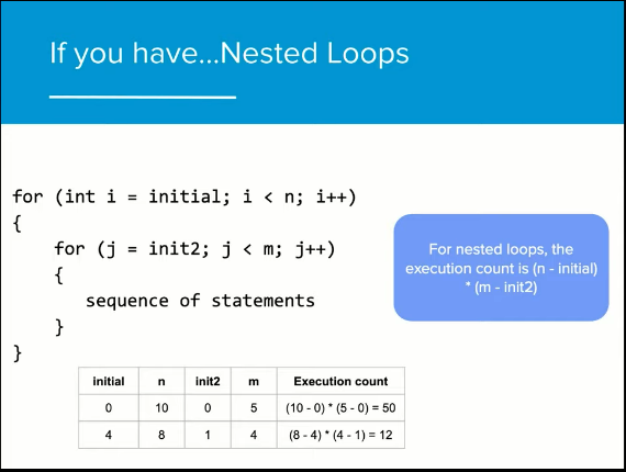 if you have if then else statements - only one of the statements will end up executing if you have for loops then the code repeats a fixed number of times, if it is a standard ++ increment the execution count is n - initial for nested or loops its (n - initial) * (m - init2)
