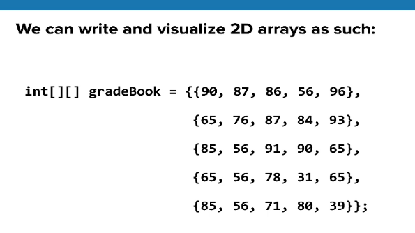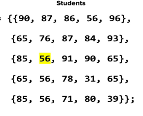 Rows are the different exams. the columns are the individual students in the gradebook if we wanted to find the exam score for a particular student, we can do so in a similar value to how we search for values in a 1D array