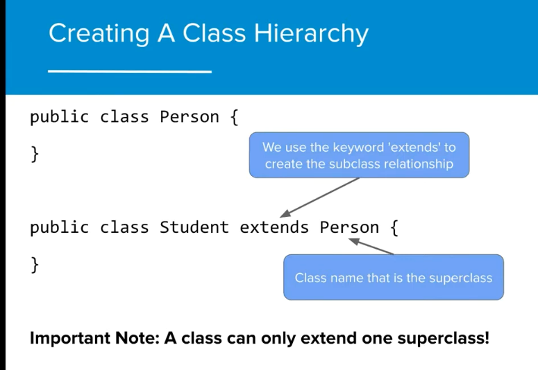 Common attributes and behaviors go in a superclass. In this example, the Person class is a Superclass. subclasses inherit public attributes and behaviours from the superclass. A superclass does not have access to attributes and behaviors of the subclass class. Student has access to student and person methods. person only has access to person methods. To create a superclass subclass relationship, we use the keyword extends followed by the name of the superclass. no modifications are needed of the superclass. A subclass can only extend one superclass.