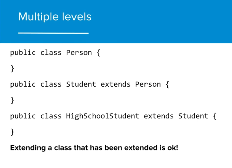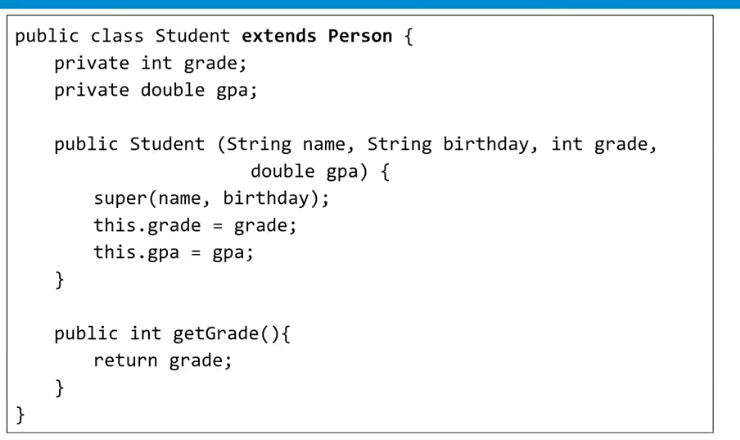 it is important to note that the class header uses the keyword extends to extend the person superclass also take note that you still pass in values for name and birthday when you create the student, but they are not found in the student class, they get passed to the person class.