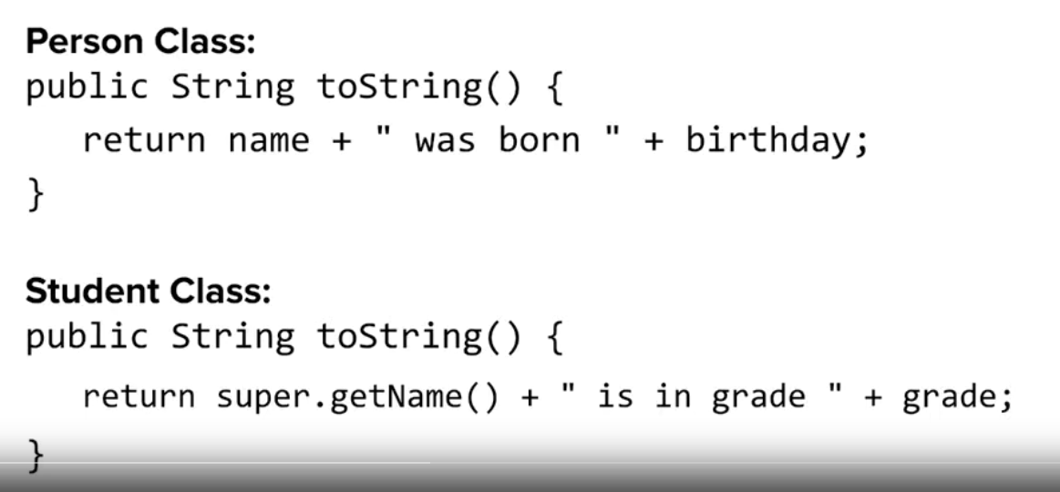 they both have the same name and same input parameters. Student class tostring overrides the person class tostring. It will be called instead of the person tostring. a person tostring will continue to use a person tostring.