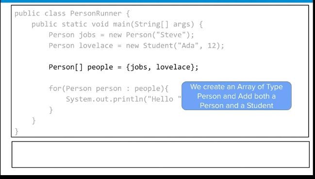 we do this to facilitate polymorphism, we can take advantage of this in a number of ways. We can use a type T as a formal parameter in a method, then pass any object of type T or S. We can create Arrays and Arraylist of a T and store any type T or S objects.