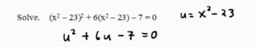 (u+7)(u-1)=0 u=-7 u=1 x^2-23=-7 x^2=16 x=+-4 x^2-23=1 x^2=24 x=+-sqrt(24) x=+-2sqrt(6)