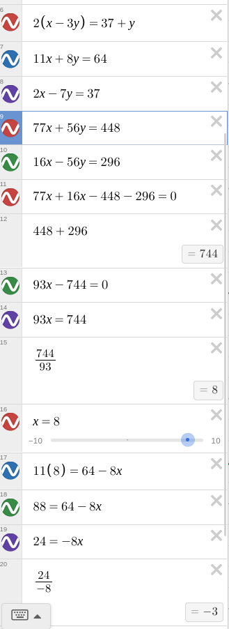 3x + 1y = 85 x + 3y = 79 -x -3y = -79 9x + 3y = 255 9x -x +79 - 255 = 0 9x -x - 176 8x - 176 = 0 8x = 176 x = 22
