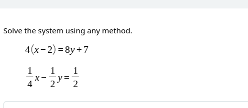 4(x-2)=8y+7 4x-8=8y+7 4x-15=8y 4x-8y=15