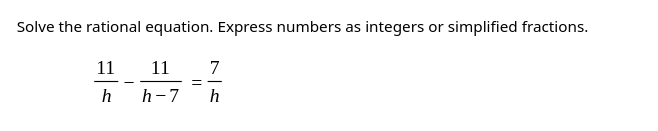 11/h - 11/(h-7) = 7/h h(h-7)(11/h - 11/(h-7)) = h(h-7)(7/h) (h-7)(11-11/7) = (h-7)(7) (h-7)(11-11/7) = 7(h-7) 11h - (11/7)h -77 -11 = 7h-49 11h - (11/7)h -88 = 7h -49 11h - (11/7)h -39 = 7h 4h - (11/7)h -39 = 0 3h - (4/7)h = 39