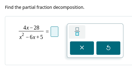 A/(x-1) + B/(x-5) = 4x-28/(x^2-6x+5) A(x-5) + B(x-1) = 4x-28 Ax + 5A + Bx -1B = 4x-28 x(A+B) + (5A -1B) 4x = x(A+B) 4 = A+B 5A -1B = -28 A=-4 B=8