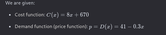 it has been determined that the cost of producing x units of a certain item is 10x + 375. the demand function is given by p = D(x) = 35 - .45x
