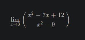 x^2-7x+12 (x-3)(x-4)/(x+3)(x-3) (x-4)/(x+3) (3-4)/(3+3) (-1)/6