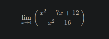 (x^2-7x+12)/(x^2-16) (x-4)(x-3)/(x-4)(x+4) (x-3)/(x+4) (4-3)/(4+4) (1)/(8)