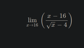 (x-16)/(sqrt(x)-4) (u^2-16)/(u-4) (u-4)(u+4)/(u-4) (u+4) sqrt(x)+4 sqrt(16)+4 8