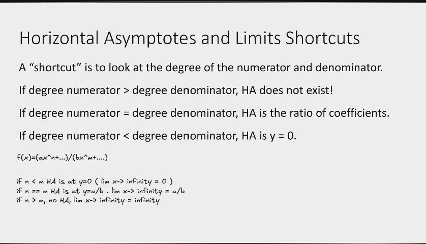 if n < m HA is at y=0 ( lim x→ infinity = 0 ) if n == m HA is at y=a/b . lim x→ infinity = a/b if n > m, no HA, lim x→ infinity = infinity
