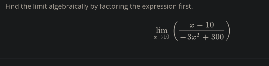 (x-10)/(-3(x+10)(x-10)) 1/-3(x+10) 1/-3(20) 1/-60 -1/60