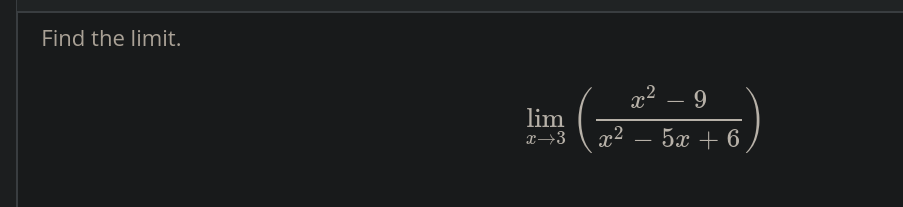 ((x+3)(x-3))/(x^2-5x+6) ((x+3)(x-3))/((x-2)(x-3)) (x+3)/(x-2) (3+3)/(3-2) 6/1 6