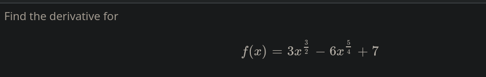 (3/2)(3)x^(1/2) + (5/4)(-6)x^(1/4) (9/2)x^(1/2) -(30/4)x^(1/4) (9/2)x^(1/2) -(15/2)x^(1/4)