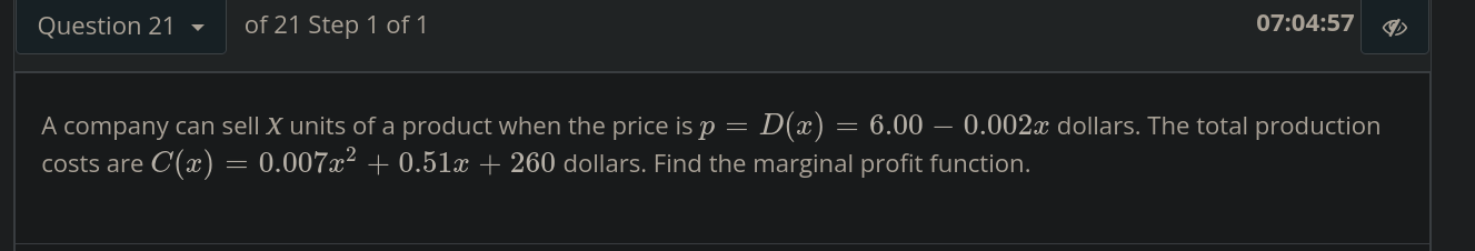 revenue - cost = profit: 6.00x - .002x^2 - .007x^2 - .51x - 260 5.49x - .009x^2 - 260