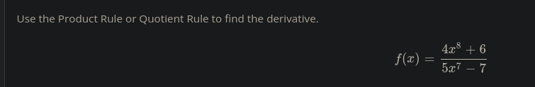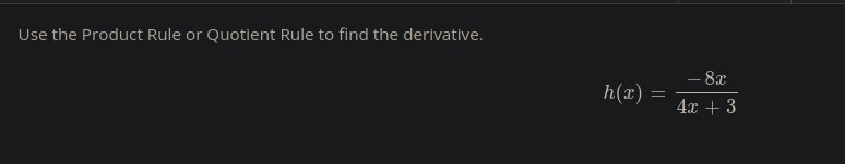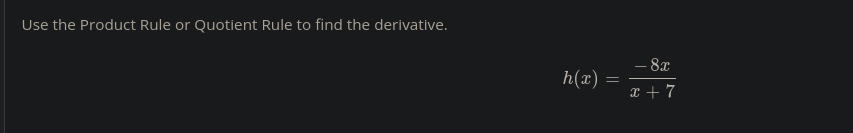 ((-8)(x+7) - (-8x)(1))/(x+7)^2 (-8x-56 + 8x)/(x+7)^2 -56/(x+7)^2