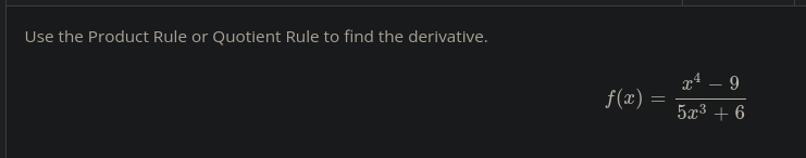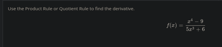 ((4x^3)(5x^3+6) - (x^4-9)(15x^2))/(5x^3+6)^2 (20x^6+24x^3 - 15x^6 + 135x^2)/(5x^3+6)^2 (5x^6+24x^3 + 135x^2)/(5x^3+6)^2