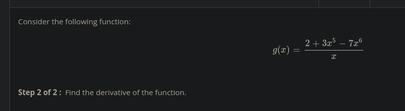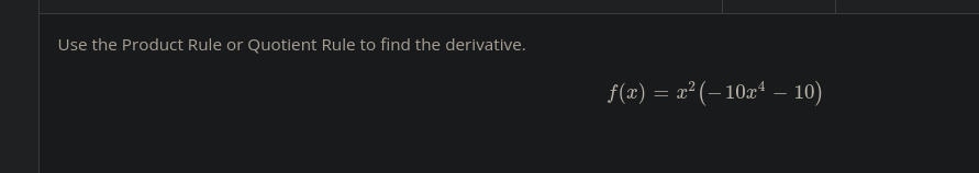 f’(x)g(x)+f(x)g’(x) (2x)(-10x^4-10) + (x^2)(-40x^3) -20x^5 -20x + -40x^5 -60x^5 - 20x