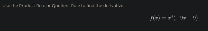 f’(x)g(x)+f(x)g’(x) 4x^3(-9x-9) + x^4(-9) 4x^3(-9x-9) -9x^4 -36x^4 -36x^3 -9x^4 -45x^4 -36x^3