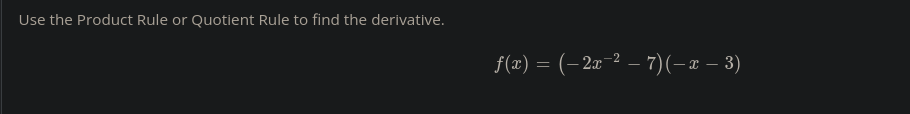 (-2x^(-2)-7)(-x-3) (4x^(-3))(-x-3) + (-2x^(-2)-7)(-1) -4x^-2 -12x^-3 + 2x^(-2)+7 -2x^-2 -12x^-3 +7