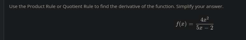 (8x)(5x-2) - (5)(4x^2) 40x^2-16x -20x^2 (20x^2-16x)/(5x-2)(5x-2) 4x(5x-4)/(5x-2)(5x-2)