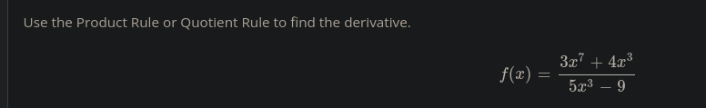 (21x^6+12x^2)(5x^3-9) - (3x^7+4x^3)(15x^2) (105x^9-189x^6+60x^5-108x^2) - (45x^9+60x^5) 105x^9-189x^6+60x^5-108x^2 - 45x^9 - 60x^5 (60x^9-189x^6-108x^2)/(5x^3)(5x^3)