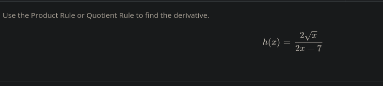 (x^-1/2)(2x+7)-(2x^(1/2)(2) 2x^(1/2) + 7x^(-1/2) - 4x^(1/2) -2x^(1/2) + 7x^(-1/2) / (2x+7)