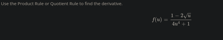 (1-2sqrt(x))/(4x^4+1) (1-2x^-1)/(4x^4+4) (f’(x)g(x) - f(x)g’(x))/(g(x)^2)
