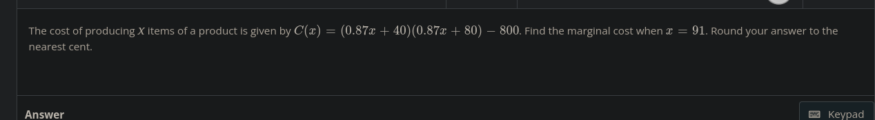 f’(x)g(x)+f(x)g’(x) (.87)(.87x+80) + (.87x + 40)(.87) .7569x+69.6 + .7569x + 34.8 1.5138x + 104.4