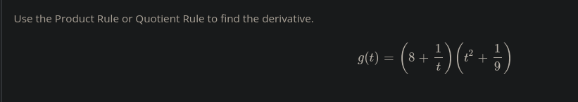 f’(x)g(x)+f(x)g’(x) (-t^-2)(t^2+1/9) + (8 + t^-1)(2t) -1 - 1/9t^-2 + 16t + 2 -1/9t^-2 + 16t +1