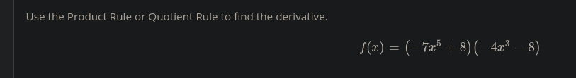 f’(x)g(x)+f(x)g’(x) (-35x^4)(-4x^3-8) + (-7x^5+8)(-12x^2) 140x^7 + 280x^4 + 84x^7 -96x^2 84x^7 + 140x^7 -96x^2 + 280x^4 224x^7 + 280x^4 - 96x^2