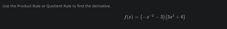 f’(x)g(x)+f(x)g’(x) (2x^-3)(3x^3+6) + (-(x^-2)-3)(9x^2) 6x^0 + 12x^-3 + -9x^0 - 27x^2 6 + 12x^-3 -9 -27x^2 -27x^2 + 12^-3 -3