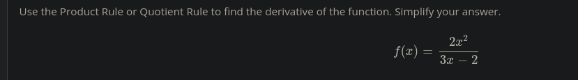 (4x)(3x-2) - (2x^2)(3) 12x^2 -8x - 6x^2 (6x^2 -8x) / (3x - 2)^2 2x(3x -4) / (3x-2)^2