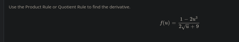 (f’(x)g(x) - f(x)g’(x))/(g(x)^2) (-6u^2)(2u^(1/2)+9) - (1-2u^3)(u^(-1/2)) -12u^5/2 -54u^2 - (u^(-1/2)+2u^(5/2)) -54u^2 -12u^5/2 - u^(-1/2) - 2u^(5/2) -54u^2 -10u^5/2 - u^(-1/2) (-10u^5/2 -54u^2 - u^(-1/2))/(2u^(1/2) + 9)^2