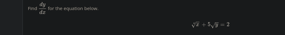 x^(1/4) + 5y^(1/2) = 2 1/4x^(-3/4) + (1/2)(5)(y^-1/2)(dy/dx) = 0 (5/2)(y^-1/2)(dy/dx) = -1/4x^(-3/4) dy/dx = (-1/4x^(-3/4))/((5/2)y^(-1/2))