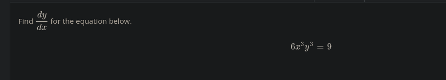 18x^2 * y^3 + 6x^3 * 3y^2 * dy/dx 18x^2 * y^3 + 18 * x^3 * y^2 * dy/dx = 0 18 * x^3 * y^2 * dy/dx = -18x^2y^3 dy/dx = -18x^2y^3/18x^3y^2 dy/dx = -y/x