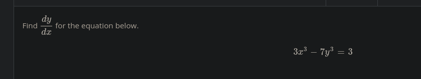 3x^3 - 7y^3 = 3 9x^2 - 21y^2 * dy/dx = 0 -21y^2dy/dx = -9x^2 21y^2dy/dx = 9x^2 dy/dx = (9x^2)/(21y^2)