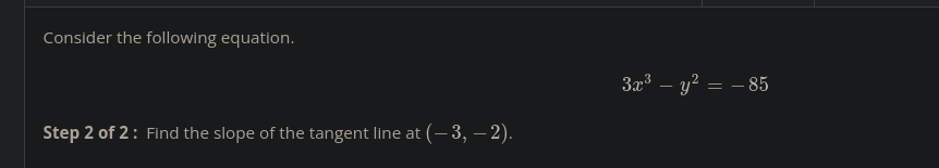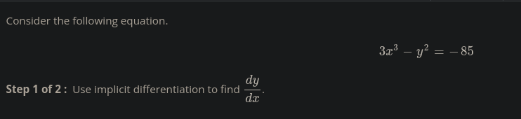 3x^3 - y^2 = -85 9x^2 - 2ydy/dx = 0 -2ydy/dx = -9x^2 2y*dy/dx = 9x^2 dy/dx = 9x^2/2y