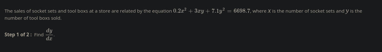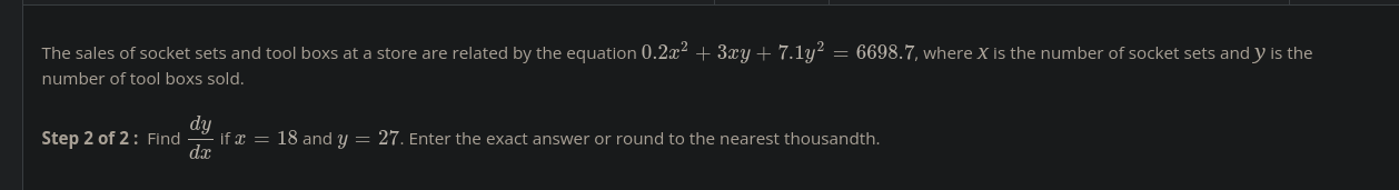 dy/dx(3x+14.2y) = -.4x-3y dy/dx = (-.4x-3y)/(3x+14.2y)