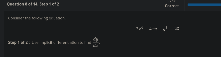 8x^3 -4y -4xdy/dx -3y^2 * dy/dx = 0 -4xdy/dx -3y^2dy/dx = -8x^3 + 4y 4xdy/dx + 3y^2*dy/dx = 8x^3 - 4y dy/dx(4x+3y^2) = 8x^3 -4y dy/dx = (8x^3-4y)/(4x+3y^2)