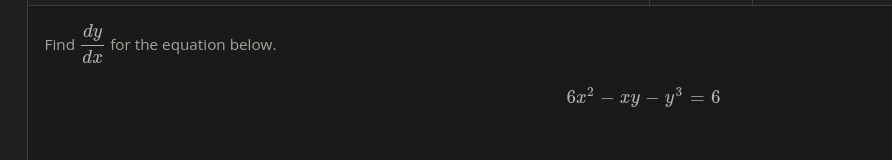 12x -y -x * dy/dx -3y^2 * dy/dx = 0 -x dy/dx -3y^2dy/dx = -12x+y xdy/dx + 3y^2dy/dx = 12x-y dy/dx(x+3y^2) = 12x-y dy/dx = (12x-y)/(x+3y^2)