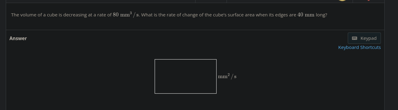 cube volume = length^3 side = 40mm volumerate = -80/s cube surface area = 6(length^2)