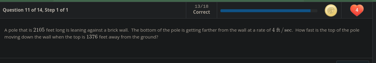 y^2+x^2=1593^2 d/dt(y^2+x^2) = d/dt(1593^2) 2ydy/dt+2xdx/dt = 0 2ydy/dt=-2xdx/dt dy/dt = (-2xdx/dt)/2y dy/dt = (xdx/dt)/y dy/dt = -x/y * dx/dt -1593/1376 * 4