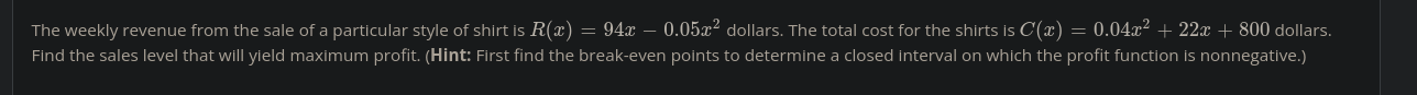 94x-.05x^2 - .04x^2 - 22x - 800 72x -.09x^2 - 800